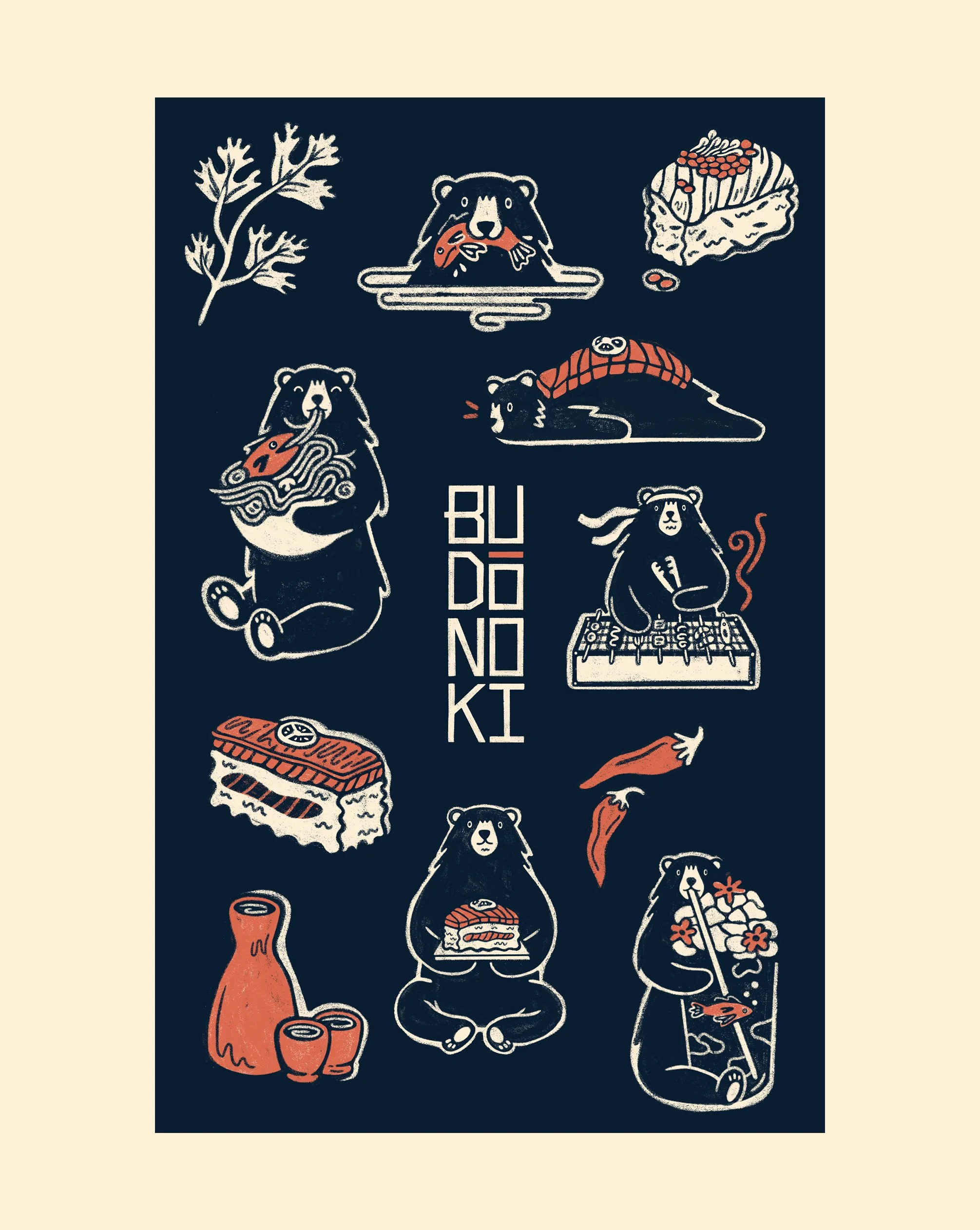 Branding identity and illustration work for Budonoki, a Silver Lake–based restaurant in Los Angeles, including custom artwork for the menu and in-restaurant merchandise. T